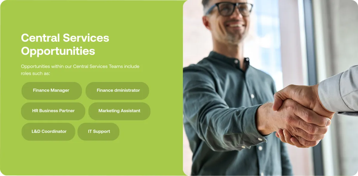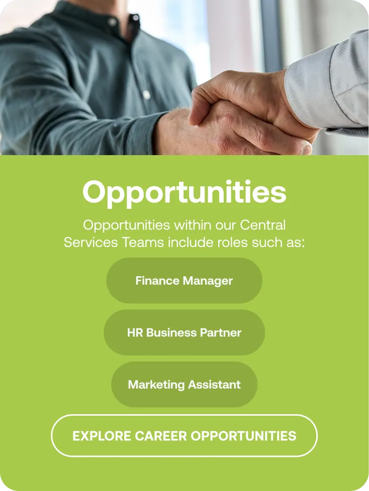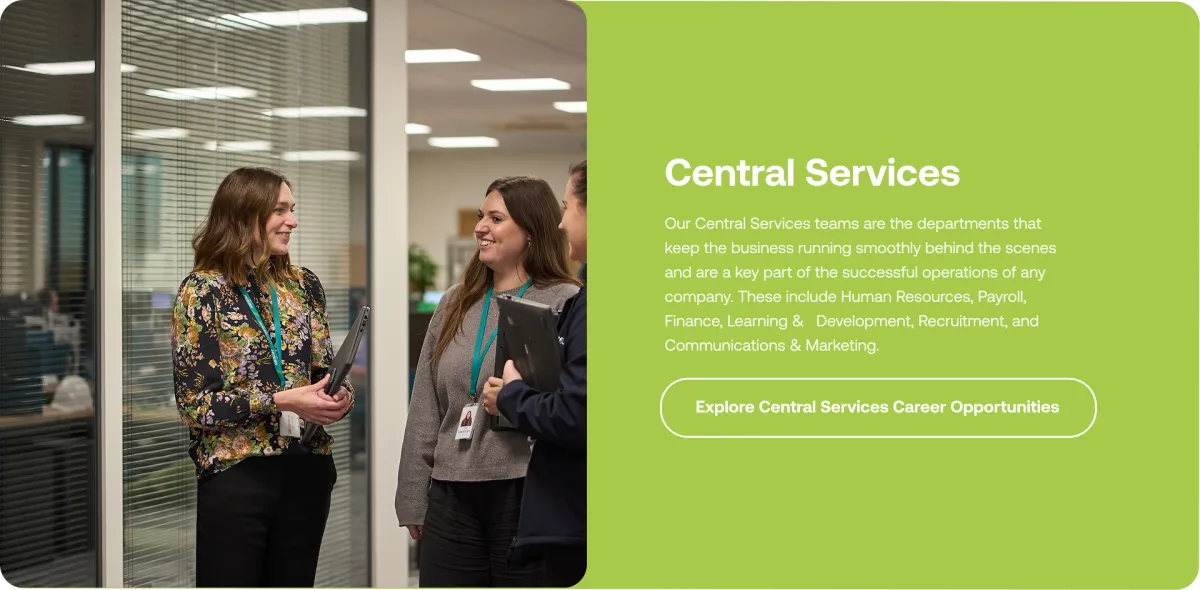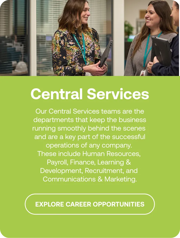 Our Central Services teams are the departments that keep the business running smoothly behind the scenes and are a key part of the successful operations of any company. These include Human Resources, Payroll, Finance, Learning & Development, Recruitment, and Communications & Marketing.