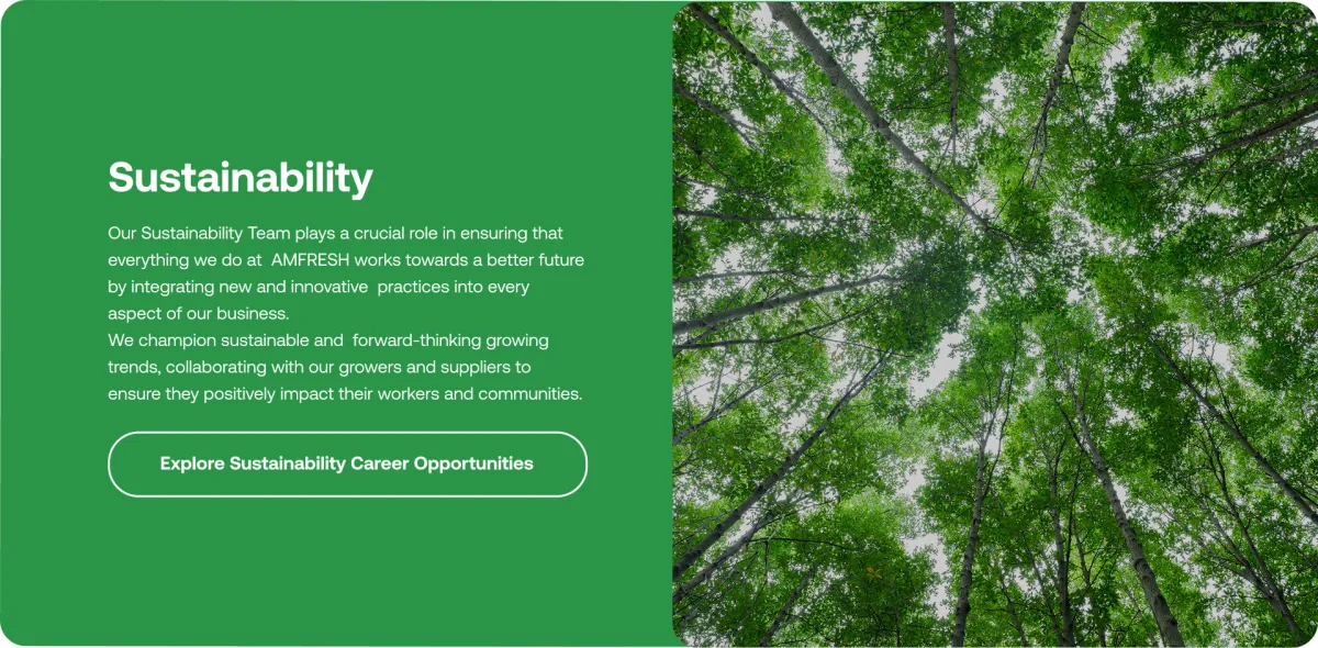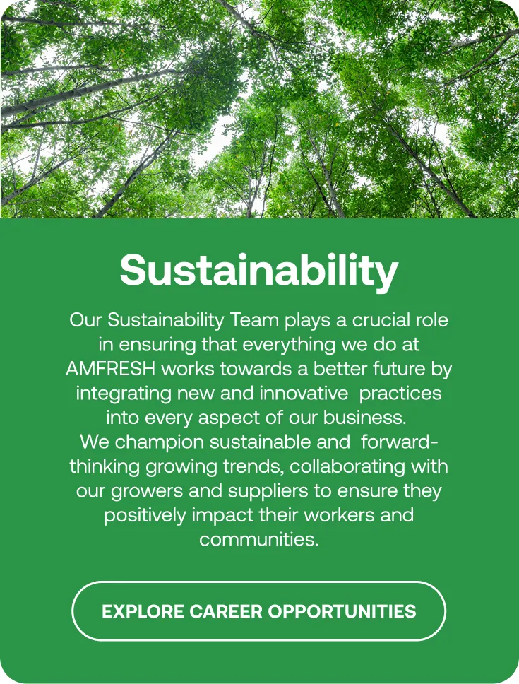Our Sustainability Team plays a crucial role in ensuring that everything we do at AMFRESH works towards a better future by integrating new and innovative practices into every aspect of our business. We champion sustainable and forward-thinking growing trends, collaborating with our growers and suppliers to ensure they positively impact their workers and communities.