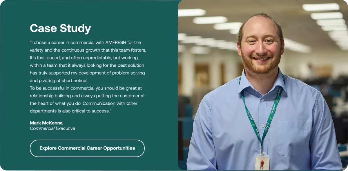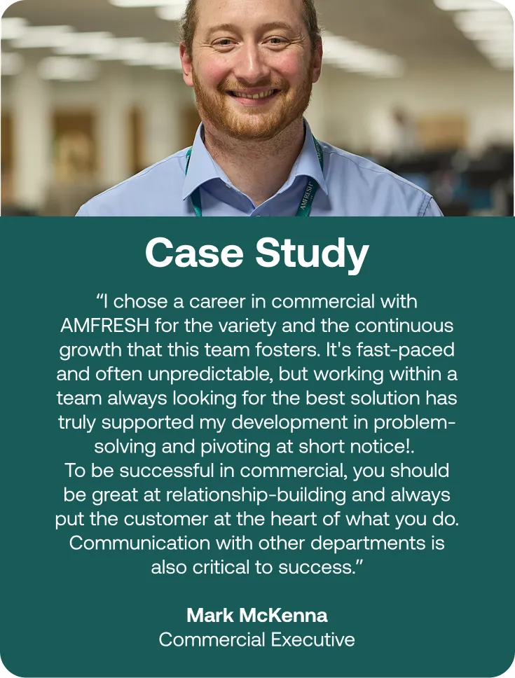 I chose a career in commercial with AMFRESH for the variety and constant improvement that's required in this team. It's fast-paced, and often unpredictable, but working within a team that it always looking for the best solution has truly supported my development of problem solving and pivoting at short notice!