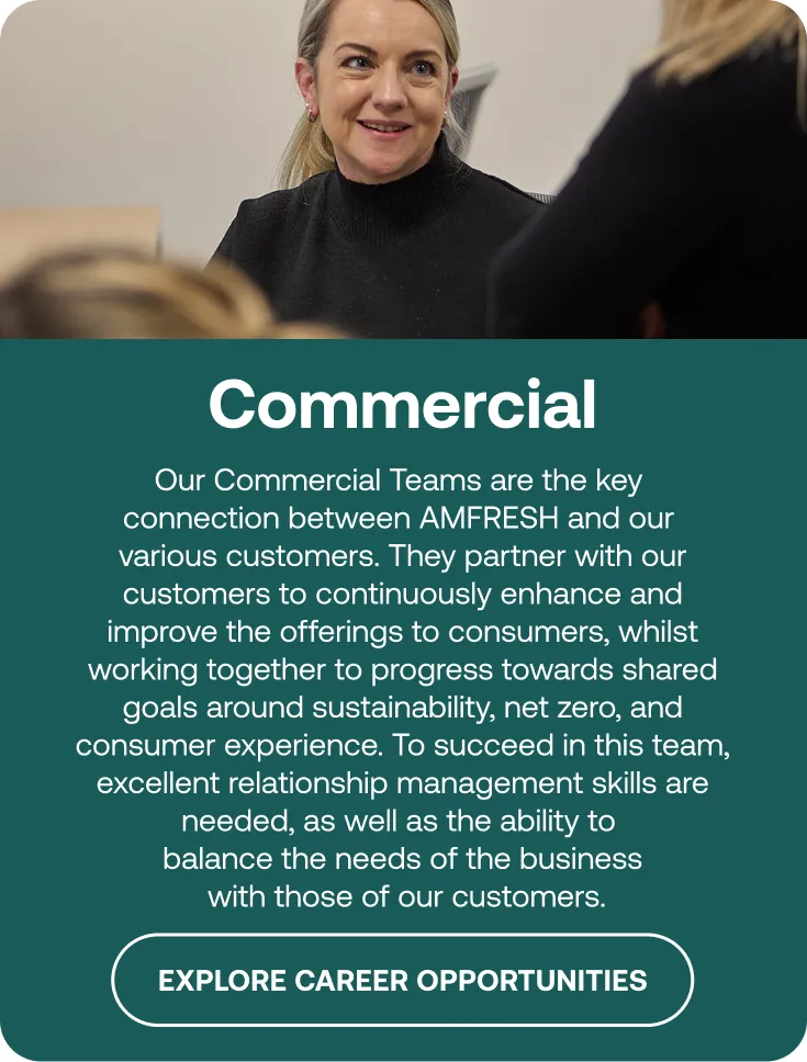 Our Commercial Teams are the key connection between AMFRESH and our various customers. They partner with our customers to continuously enhance and improve the offerings to consumers, whilst working together to progress towards shared goals around sustainability, net zero, and consumer experience. To succeed in this team, excellent relationship management skills are needed, as well as the ability to balance the needs of the business with those of our customers.