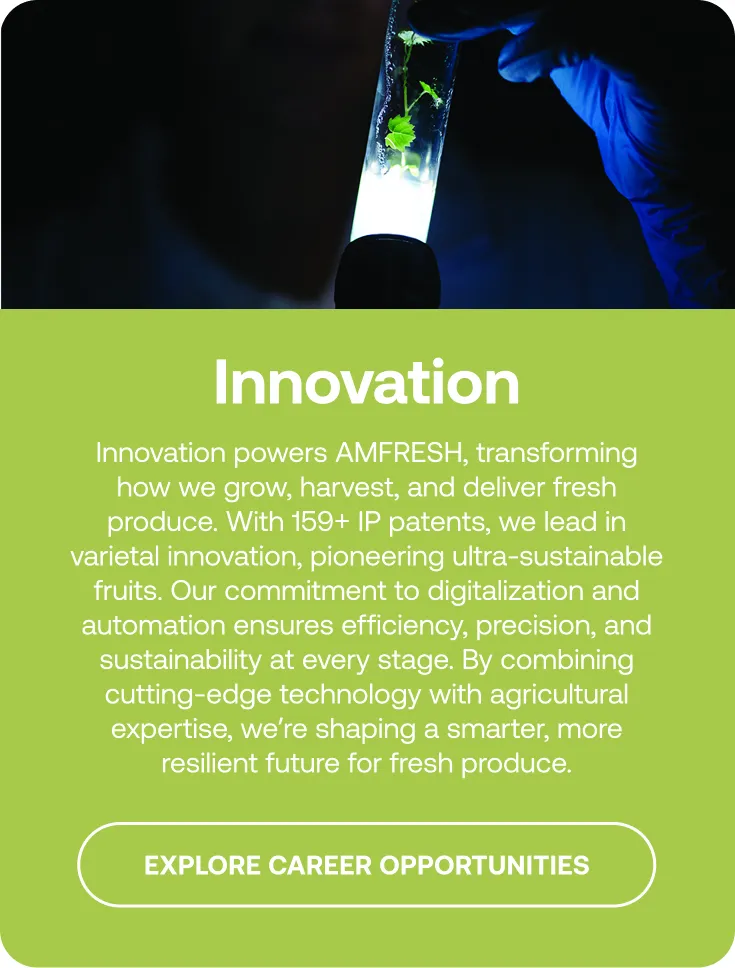 Innovation is the engine that powers AMFRESH, transforming the way we grow, harvest, and deliver fresh produce. From genetics to farming and operations, we continuously push the boundaries of what’s possible. As global leaders in varietal innovation, we hold over 159 IP patents, pioneering new categories of ultra-sustainable fruits. Our commitment to digitalization and automation ensures efficiency, precision, and sustainability at every stage. By integrating cutting-edge technology with deep agricultural expertise, we are shaping the future of fresh produce—smarter, more sustainable, and more resilient than ever.
