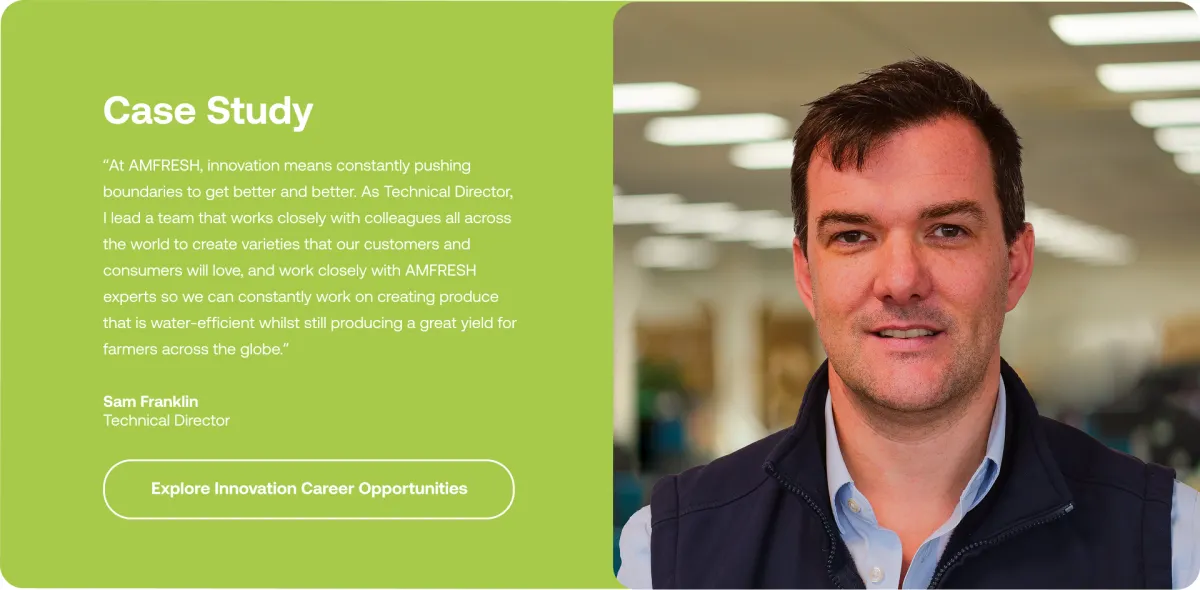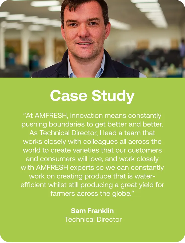 “At AMFRESH, innovation means constantly pushing boundaries to get better and better. As Technical Director, I lead a team that works closely with colleagues all across the world to create varieties that our customers and consumers will love, and work closely with AMFRESH experts so we can constantly work on creating produce that is water-efficient whilst still producing a great yield for farmers across the globe.”