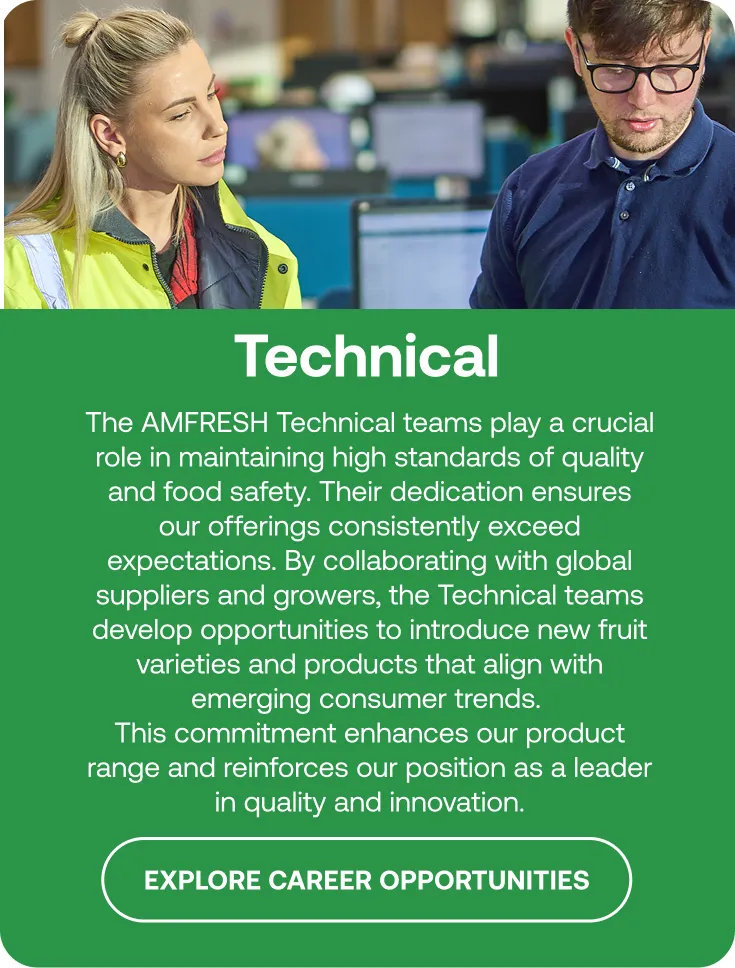 The AMFRESH Technical teams play a crucial role in maintaining high standards of quality and food safety for the products we supply. Their dedication ensures that our offerings consistently meet and exceed our customers' expectations. By collaborating closely with suppliers and growers globally, the Technical teams are instrumental in developing opportunities for introducing new fruit varieties and products that align with emerging consumer trends. This commitment not only enhances our product range but also reinforces our position in the market as a leader in quality and innovation.
