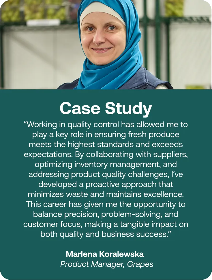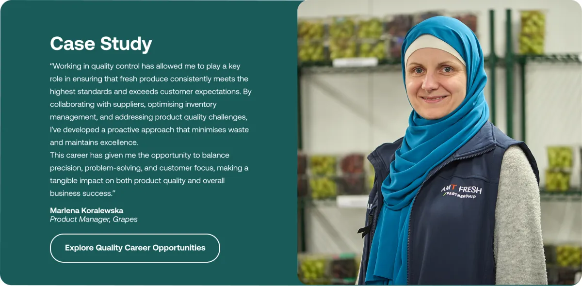 “Working in quality control has allowed me to play a key role in ensuring that fresh produce consistently meets the highest standards and exceeds customer expectations. By collaborating with suppliers, optimising inventory management, and addressing product quality challenges, I’ve developed a proactive approach that minimises waste and maintains excellence.