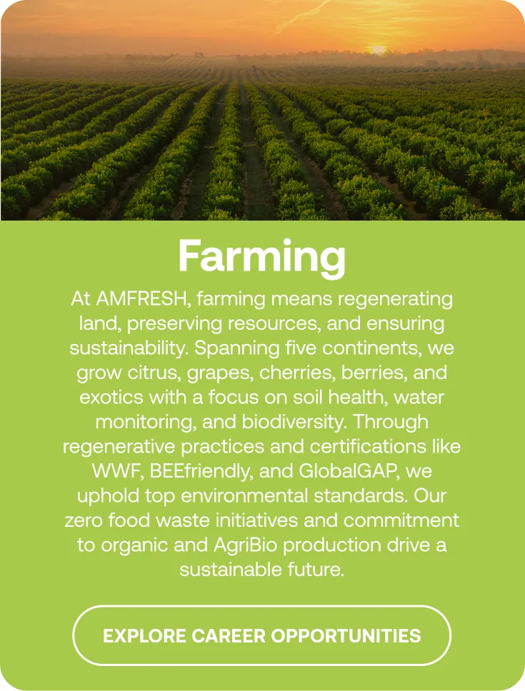 At AMFRESH, farming is more than just growing produce—it’s about regenerating the land, preserving resources, and ensuring a sustainable future. Our farms span five continents, producing citrus, table grapes, cherries, berries, exotics, and more, all with a hyper-focus on soil health, water monitoring, and biodiversity. Through regenerative farming practices and global certifications like WWF, BEEfriendly, and GlobalGAP, we maintain the highest environmental standards. With zero food waste initiatives and a commitment to organic and AgriBio production, we’re shaping a future where farming and sustainability go hand in hand.