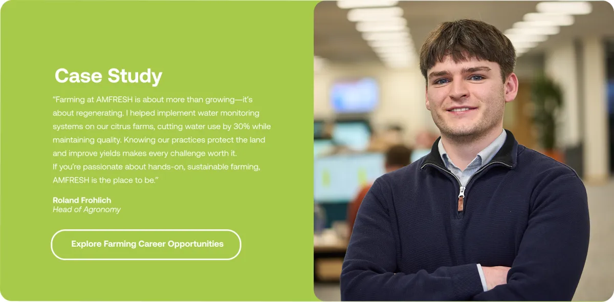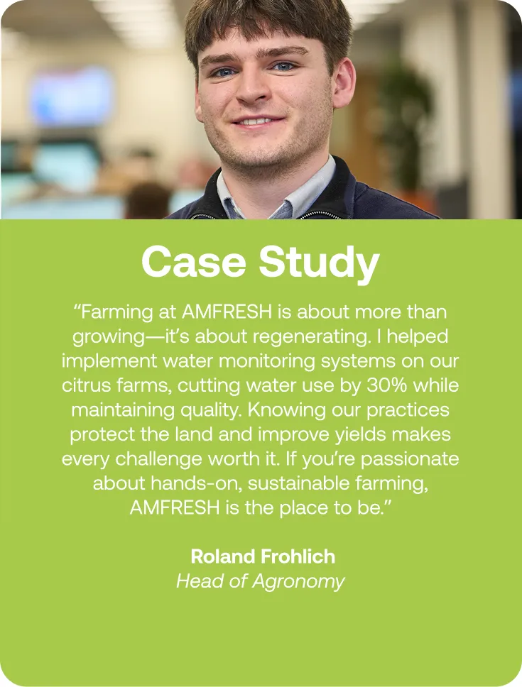“Farming at AMFRESH is about more than growing—it’s about regenerating. I helped implement water monitoring systems on our citrus farms, cutting water use by 30% while maintaining quality. Knowing our practices protect the land and improve yields makes every challenge worth it.