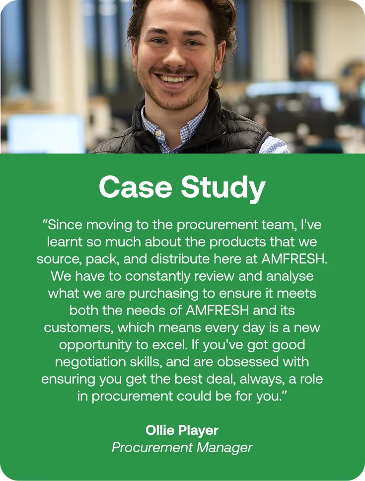 “Since moving to the procurement team, I've learnt so much about the products that we source, pack, and distribute here at AMFRESH. We have to constantly review and analyse what we are purchasing to ensure it meets both the needs of AMFRESH and its customers, which means every day is a new opportunity to excel.