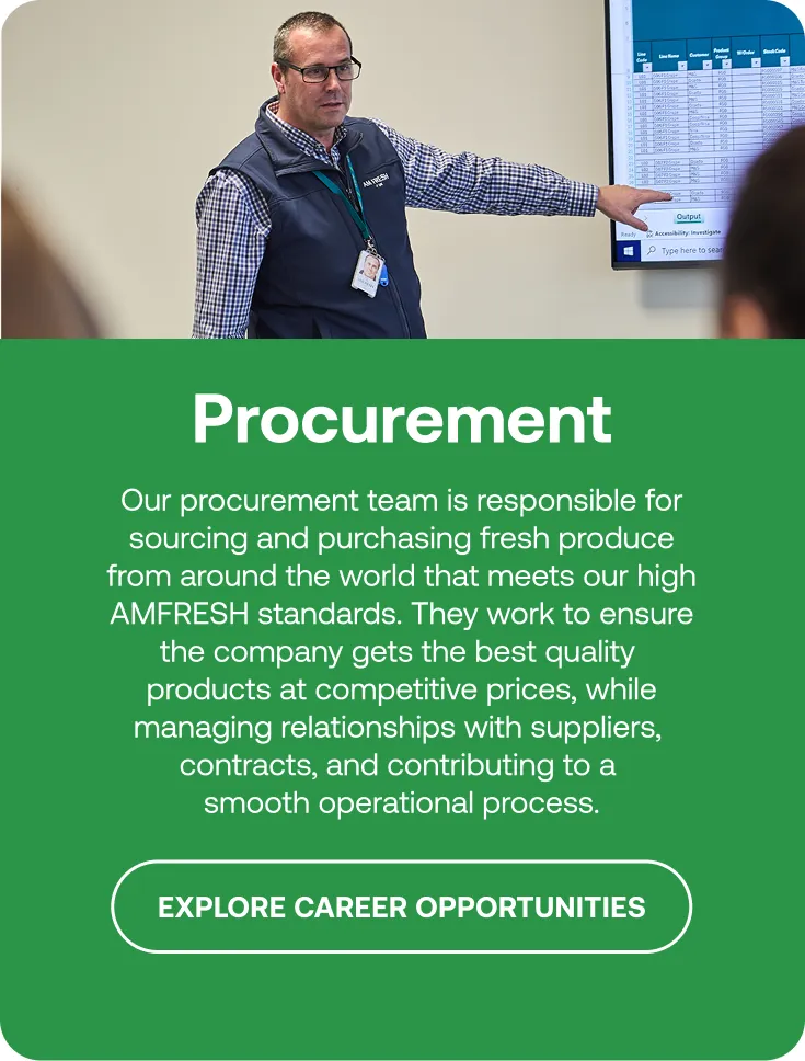 Our procurement team is responsible for sourcing and purchasing fresh produce from around the world that meets our high AMFRESH standards. They work to ensure the company gets the best quality products at competitive prices, while managing relationships with suppliers, contracts, and contributing to a smooth operational process.