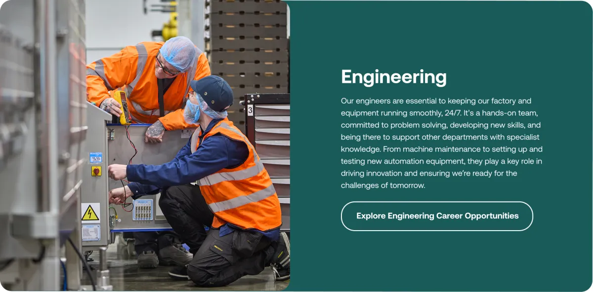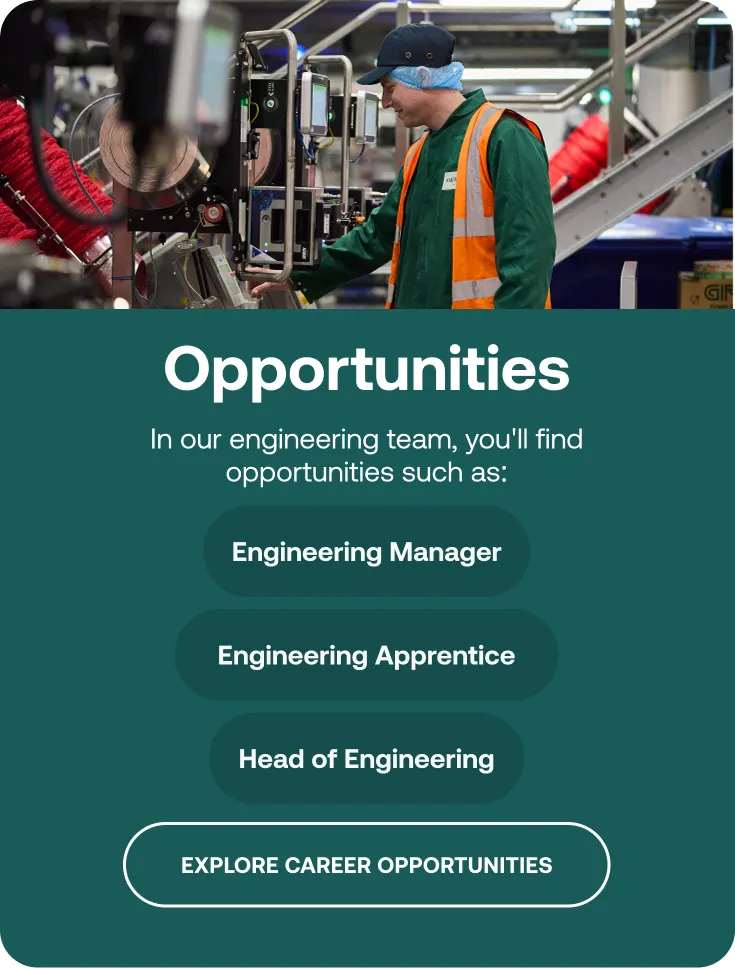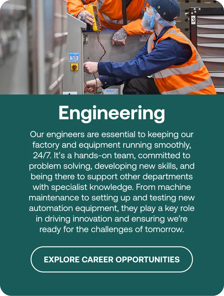 Our engineers are essential to keeping our factory and equipment running smoothly, 24/7. It's a hands-on team, committed to problem solving, developing new skills, and being there to support other departments with specialist knowledge. From machine maintenance to setting up and testing new automation equipment, they play a key role in driving innovation and ensuring we’re ready for the challenges of tomorrow.