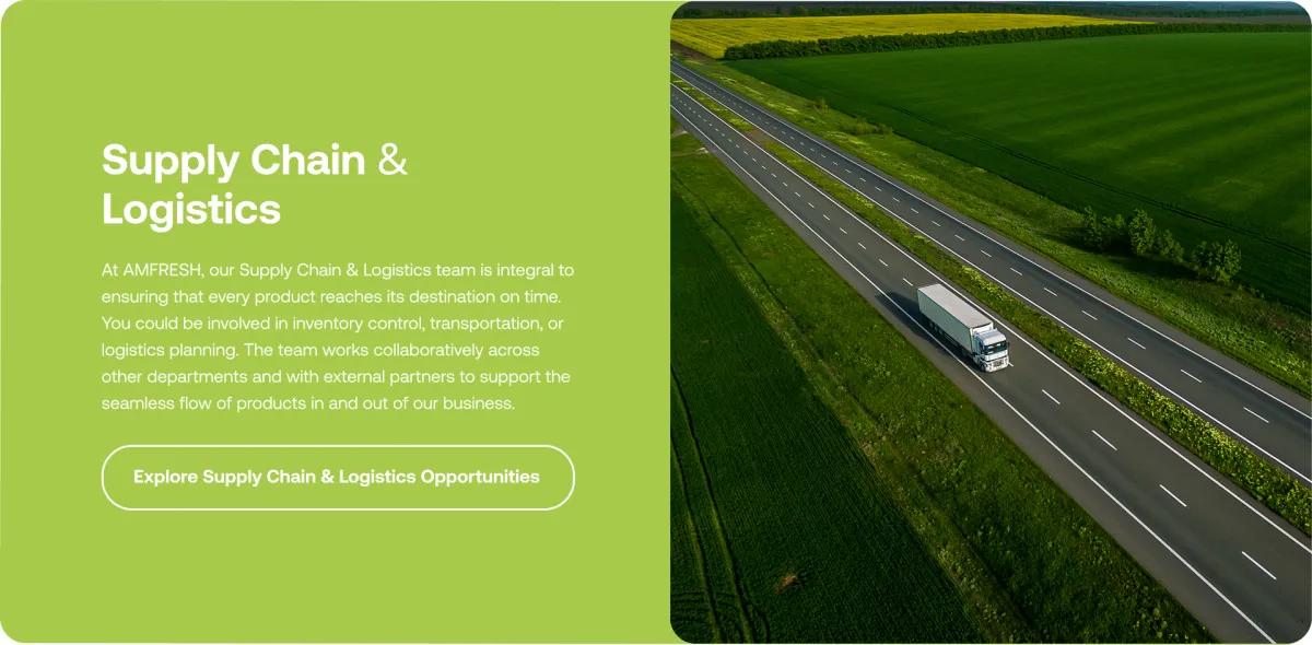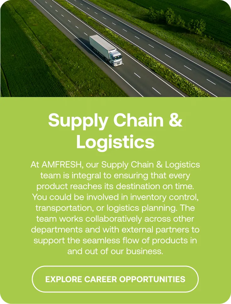At AMFRESH, our Supply Chain & Logistics team is integral to ensuring that every product reaches its destination on time. You could be involved in inventory control, transportation, or logistics planning. The team works collaboratively across other departments and with external partners to support the seamless flow of products in and out of our business.