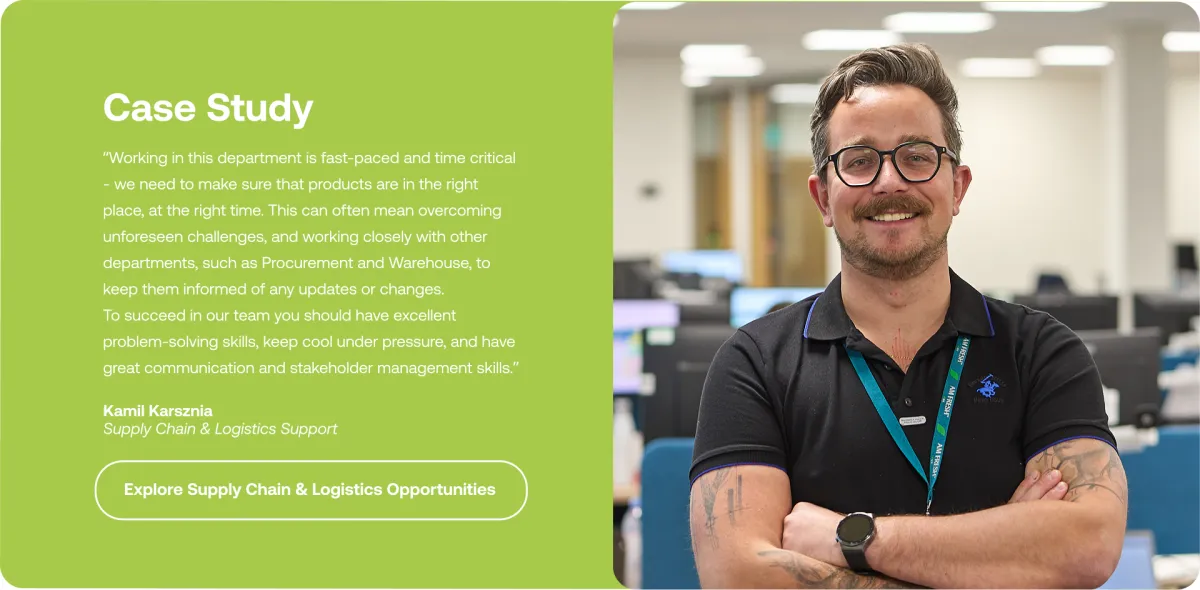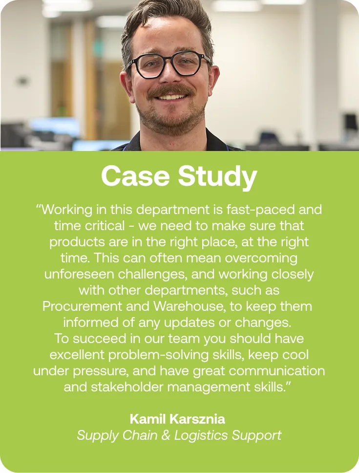 “Working in this department is fast-paced and time critical - we need to make sure that products are in the right place, at the right time. This can often mean overcoming unforeseen challenges, and working closely with other departments, such as Procurement and Warehouse, to keep them informed of any updates or changes.