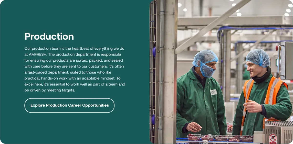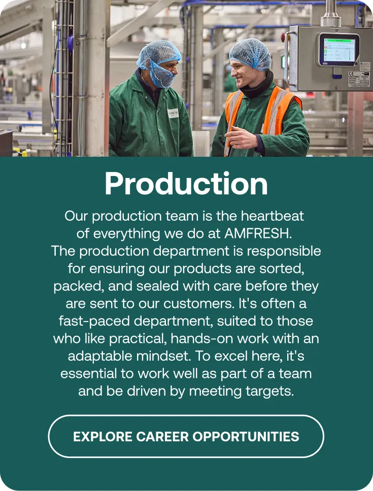 Our production team is the heartbeat of everything we do at AMFRESH. The production department is responsible for ensuring our products are sorted, packed, and sealed with care before they are sent to our customers. It's often a fast-paced department, suited to those who like practical, hands-on work with an adaptable mindset. To excel here, it's essential to work well as part of a team and be driven by meeting targets.