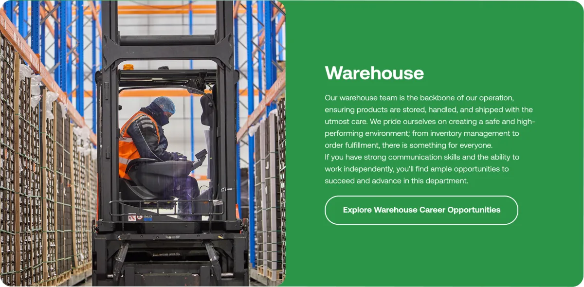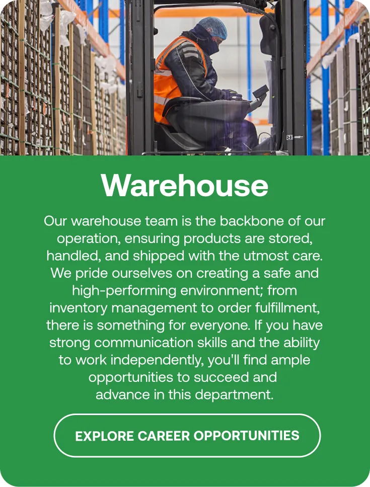 Our warehouse team is the backbone of our operation, ensuring products are stored, handled, and shipped with the utmost care. We pride ourselves on creating a safe and high-performing environment; from inventory management to order fulfillment, there is something for everyone.