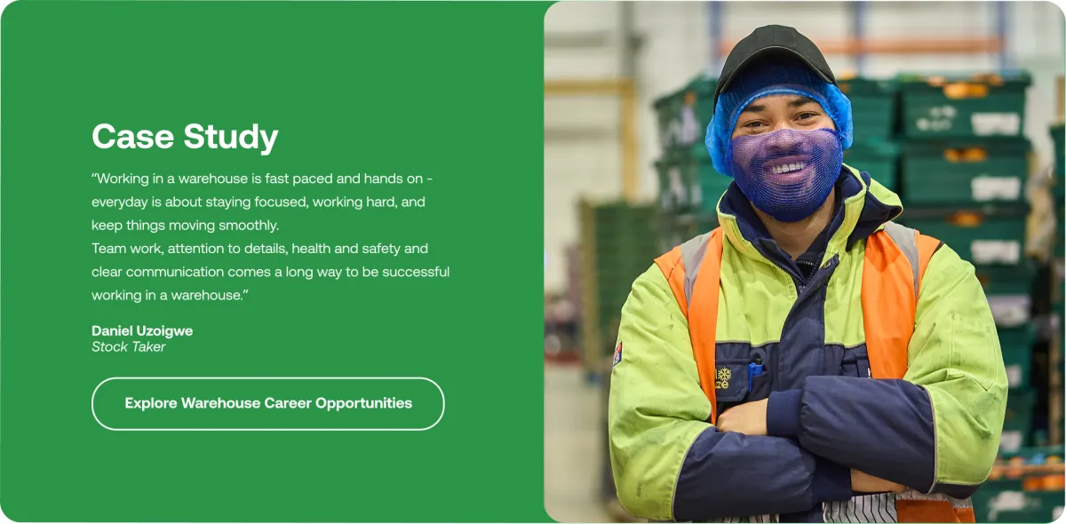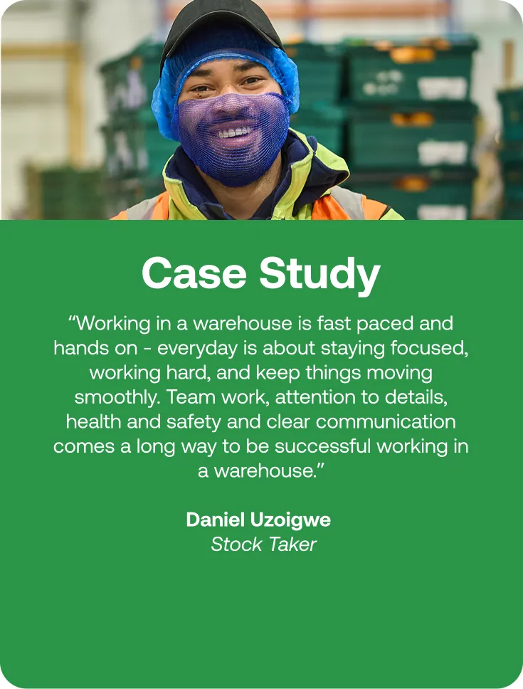 “Working in a warehouse is fast paced and hands on. Every day is about staying focused, working hard, and keeping things moving smoothly.