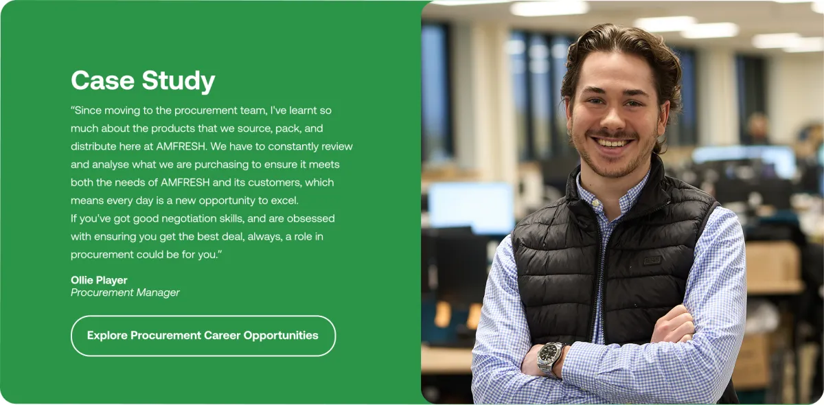Since moving to the procurement team, I've learnt so much about the products that we source, pack, and distribute here at AMFRESH. We have to constantly review and analyse what we are purchasing to ensure it meets both the needs of AMFRESH and its customers, which means every day is a new opportunity to excel.