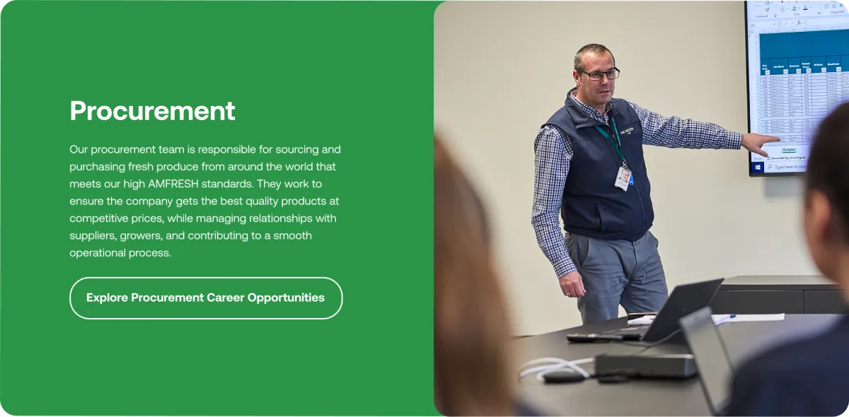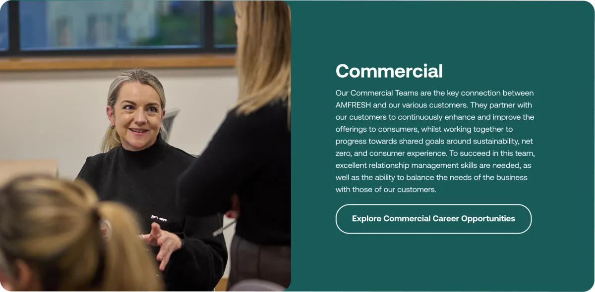 At AMFRESH, our success is driven by the diverse skills, knowledge, and expertise of our people across various departments. From commercial to engineering, you'll find a place where you can grow and develop here. Scroll to explore the different teams that make up our dynamic operation, or jump to sections relevant for you using the buttons below.
