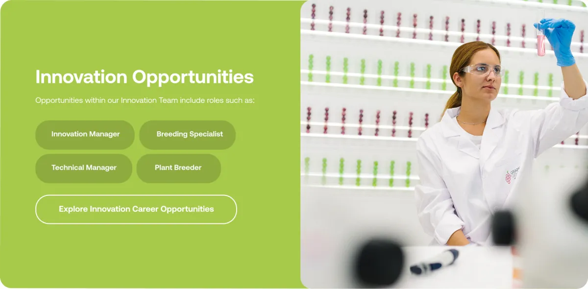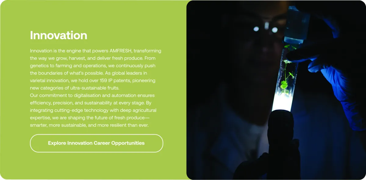 Innovation is the engine that powers AMFRESH, transforming the way we grow, harvest, and deliver fresh produce. From genetics to farming and operations, we continuously push the boundaries of what’s possible. As global leaders in varietal innovation, we hold over 159 IP patents, pioneering new categories of ultra-sustainable fruits. Our commitment to digitalisation and automation ensures efficiency, precision, and sustainability at every stage. By integrating cutting-edge technology with deep agricultural expertise, we are shaping the future of fresh produce—smarter, more sustainable, and more resilient than ever.